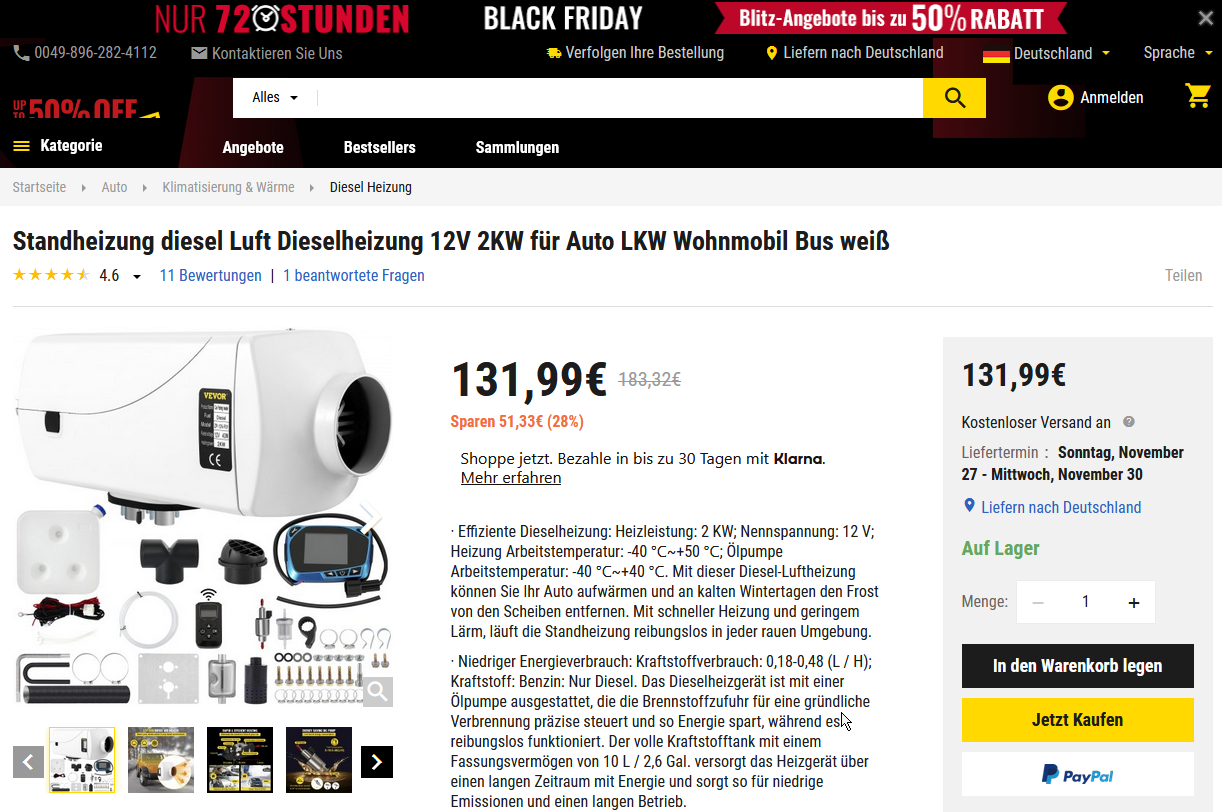 Ich habe mir eine 2kW bei Vevor gegönnt für meine isolierte Gartenhütte mit ~30m³ zu behiezen. Krass wie wenig Diesel man so verbraucht. https://www.vevor.de/diesel-heizung-c_10321/2kw-12v-diesel-standheizung-luftheizung-heizung-heizgeraet-air-heater-lcd-pkw-p_010774880260