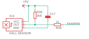 Und den Hallsensor verlängern (ist wohl ein TO-92) und 2 Magnete auf eine große 4mm U-Scheibe kleben und diese Anstelle des alten Lüfters aufpressen. Weiß zufällig gemand den Typen? Ich vermute ja einen Unipolaren wie den SS411 allein aus dem Schaltbild (s.u.).