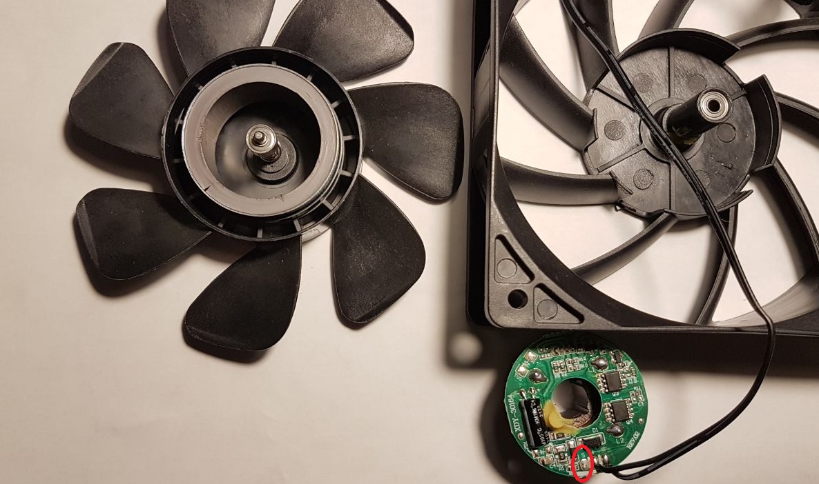 Wie erwartet kann das Hallsignal abgegriffen werden, es ist sogar bereits ein entsprechender Anschluss am Lüfter vorgesehen (Lötpad mit Beschriftung "S" =Speed?).