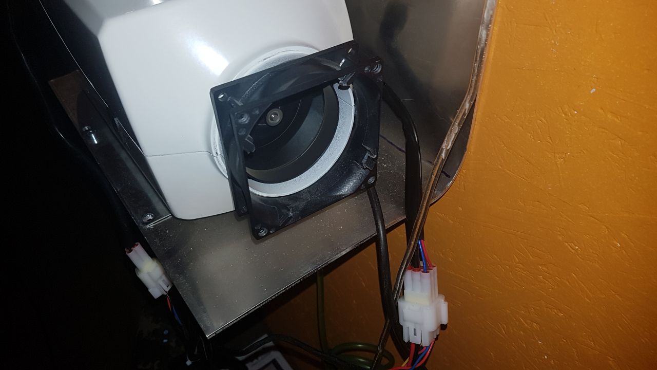 Zum Lüfterumbau: Leider ist mein Lüfter-Adapter von 120mm auf 80mm noch nicht angekommen. Ein ausgehölter, defekter 80er Lüfter passt schon mal super auf die Ansaugöffnung um den Adapter anzuflanschen. Vlt Etwas zu fest, ich werde das Lüftergehäuse an einer Stelle einschlitzen, mit einer Schlauchschelle befestigen und anschließend den Adapter anflanschen