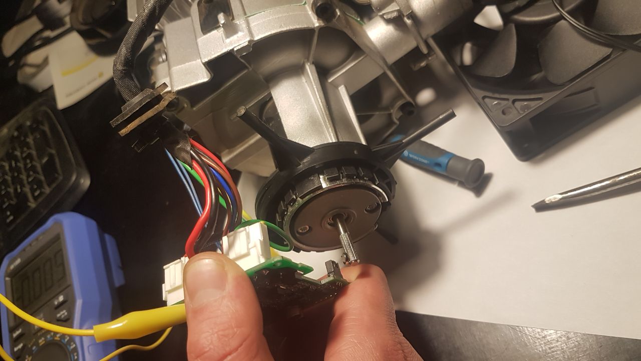 Zum Hallsensor: Die Magnete sind verdreht eingebaut, das heißt bei einem zeigt Norden richtung Einlass und beim anderen Süden. Der Sensor ist aber ofenbar Unipolar, er schaltet nur auf Süden, der andere Magnet ist also offenbar nur als Ausleichsmasse verbaut. Auf dem Hall-Sensor steht E44 YS168, was auf einen Nachbau eines A3144 der für Hochtremperaturanwendungen gemacht ist hindeutet. Falls den mal einer tauschen muss sollte der passen.Zum Test habe ich den Sensor mal vor einen einzelnen Magneten gehalten der einfach an der Welle haftet und siehe da, Heizung startet normal ohne Fehlermeldung. Ohne Hallsignal dreht sie wenige Sekunden auf fast max Drehzahl und geht dann in E06. Es wird also wohl das einfachste sein den Sensor auszulöten und Richtung Welle zu verlängern, evtl sollte ich mir so einen mal auf Ersatz hinlegen. Einen zweiten Magneten auf die Welle kleben tut aber auch nicht weh, Hauptsache die Polarität ist umgedreht