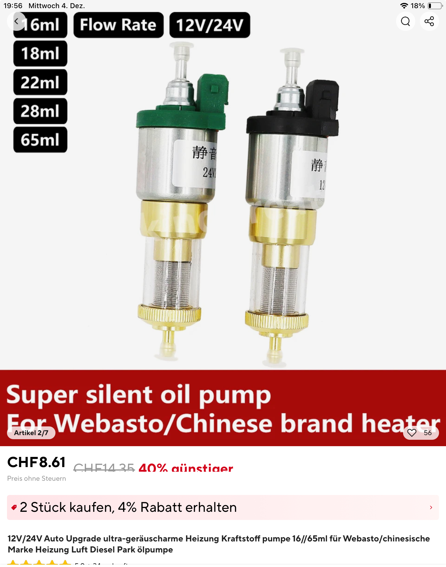 Zitat von LiberoV am 4. Dezember 2024, 19:58 UhrHallo, hast du eine neue Pumpe gekauft wegen dem Lärm, oder weil du mehr heizen möchtest mit 28ml ? Bei Amazon für ca. 20 zu haben und bei AliExpress scheint dieselbe nur 8 zu kosten. Ob alle aus der gleichen Produktion kommen wäre interessant zu wissen. Ich dachte die Heizleistung könne man mit der Taktfrequenz regulieren?