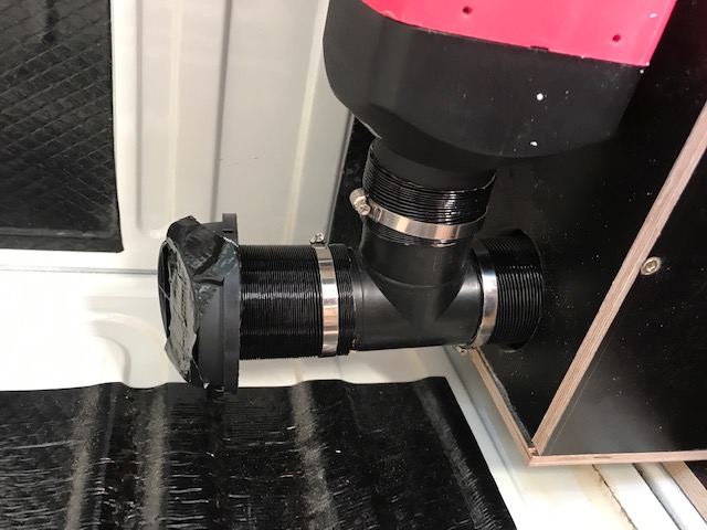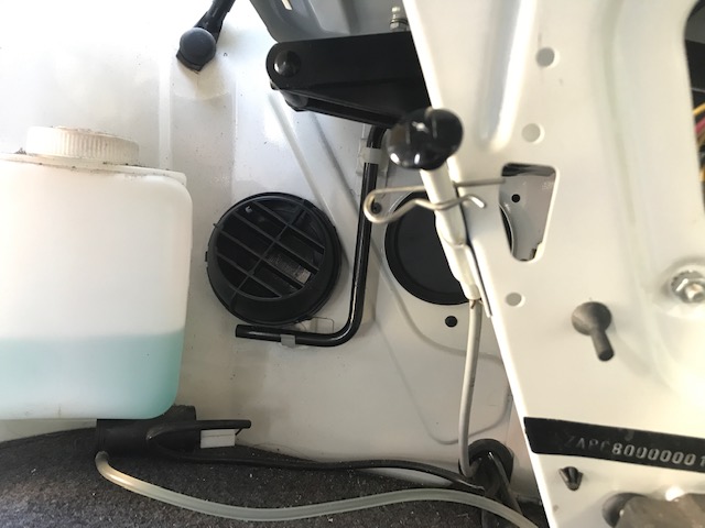 Den Ausströmer / Durchführung in die Fahrerkabine habe ich direkt neben der Zwangsentlüfttung platziert (das ist eine Gummiabdeckung auf einer Karosserieöffnung, die dafür sorgt, dass kein Überdruck in der Kabine durch die Frischlüftöffnung erzeugt wird und somit keine Frischluft einströmen kann. Ich halte diese Entlüftungsöffnung für nett, aber letztlich total überflüssig im Normalfall. Bei Verwendung der Standheizung macht diese aber auf einmal Sinn, denn das Luftvolumen, was durch die Warmluftausströmung auf höchster Stufe erzeugt wird, ist deutlich größer, als der Kaltluftstrom, der im Sommer bei geöffneter Frischluftdüse einströmt).