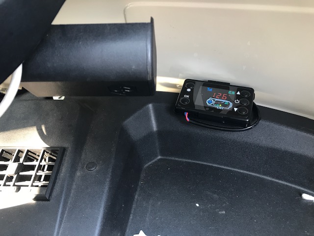 die Leitung durch vorhandene Durchführungen in die Kabine geführt. Im weiteren Verlauf wurde die Leitung unter der schwarzen Kunststoffabdeckung (Mitteltunnel) weitergeführt und unter der Ablage herausgeführt. Das Bedienteil hatte ich ursprünglich auf dem Aschenbecher montiert, jedoch war dies dort der Sonneneinstrahlung direkt ausgesetzt, was einerseits das Bedienteil aufheizte (und somit den Temperatursensor beeinflusste) und die Ablesbarkeit tendierte gegen Null. Mittlerweile hat das Bedienteil seinen Platz auf der Ablage gefunden und ist dort mit einem Klettband befestigt.