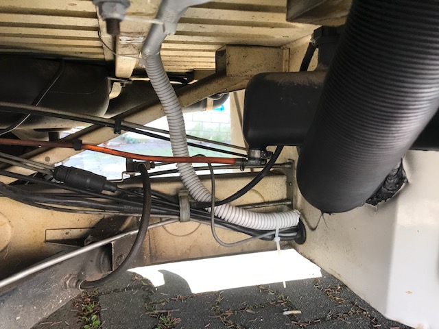 Unter dem Boden kann man sehen, wie die Leitung in die Kabine geführt wurde. Ich habe ein Leerrohr verwendet, in dieses die Leitung eingezogen und