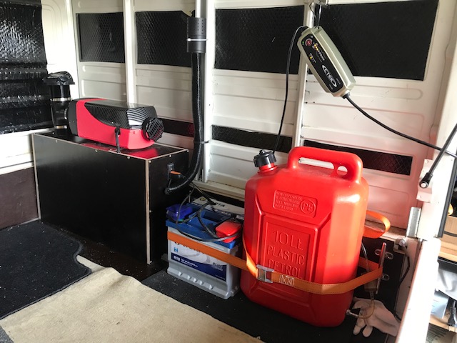 befestigt ist. Der Boden ist mit Armaflex isoliert.In Fahrtrichtung rechts befindet sich nun eine Box, auf der die Standheizung montiert ist. In der Box verläuft das erste Stück