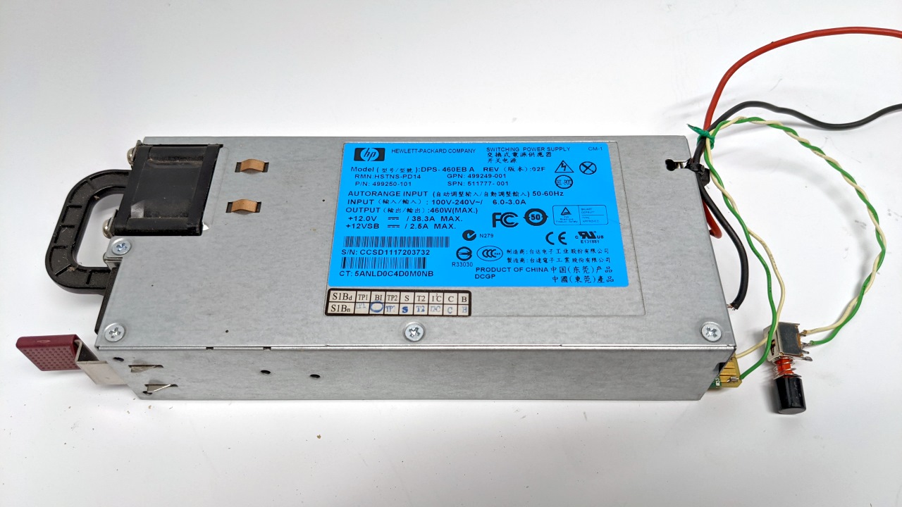 Unten im Bild ist ein HP Server Netzteil vom Typ DPS-460EB, 12 Volt mit bis zu 460 Watt. Damit könnte man sogar zwei Heizungen versorgen.