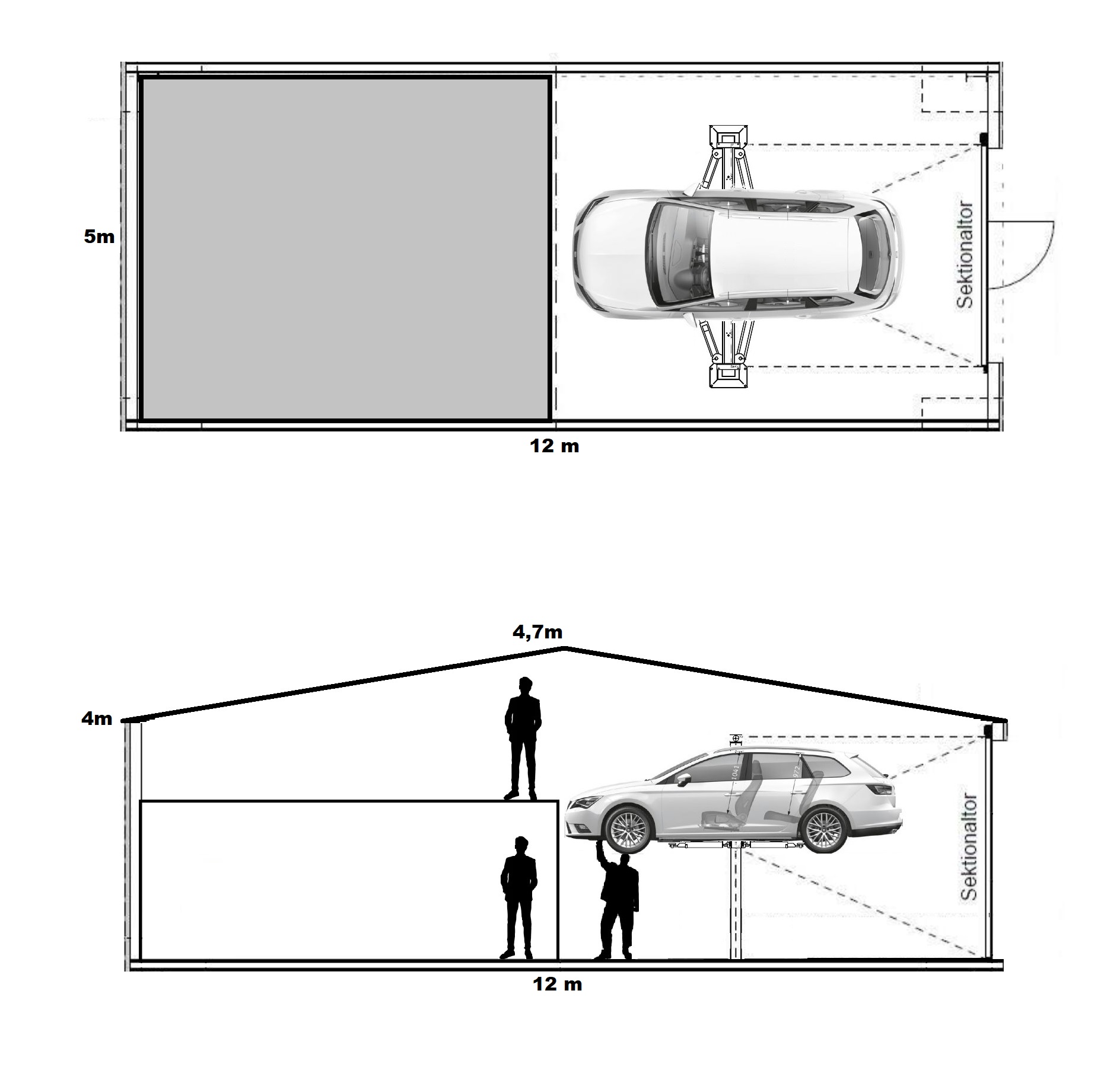 Zur Garage selber habe ich folgenden Ausgangslage, die Garage ist 12 m lang, etwa 5 m breit und hat ein Dach mit dessen höchstem Punkt von 4,7 m und einen „flachsten“ Punkt von 4 m. Zur Vereinfachung würde ich sagen 4 m hoch, dadurch ergibt sich schon das Volumen von 240qm, wenn mich meine mathematischen Künste gerade nicht völlig im Stich gelassen haben, und da tut sich auch schon meine erste Frage auf, denn diese Raumvolumen auf eine arbeiterfreundliche Temperatur zu bringen wird sicher nicht leicht. Ich hänge mal ein Bild mir ran zur Visualisierung, ich persönlich finde das immer spannender als nur Text, zu erkennen ist auch die Aufteilung auf eine kommende zweite Ebene worunter ich ggf. später die Luftleitungen zur Verteilung anbringen würde.