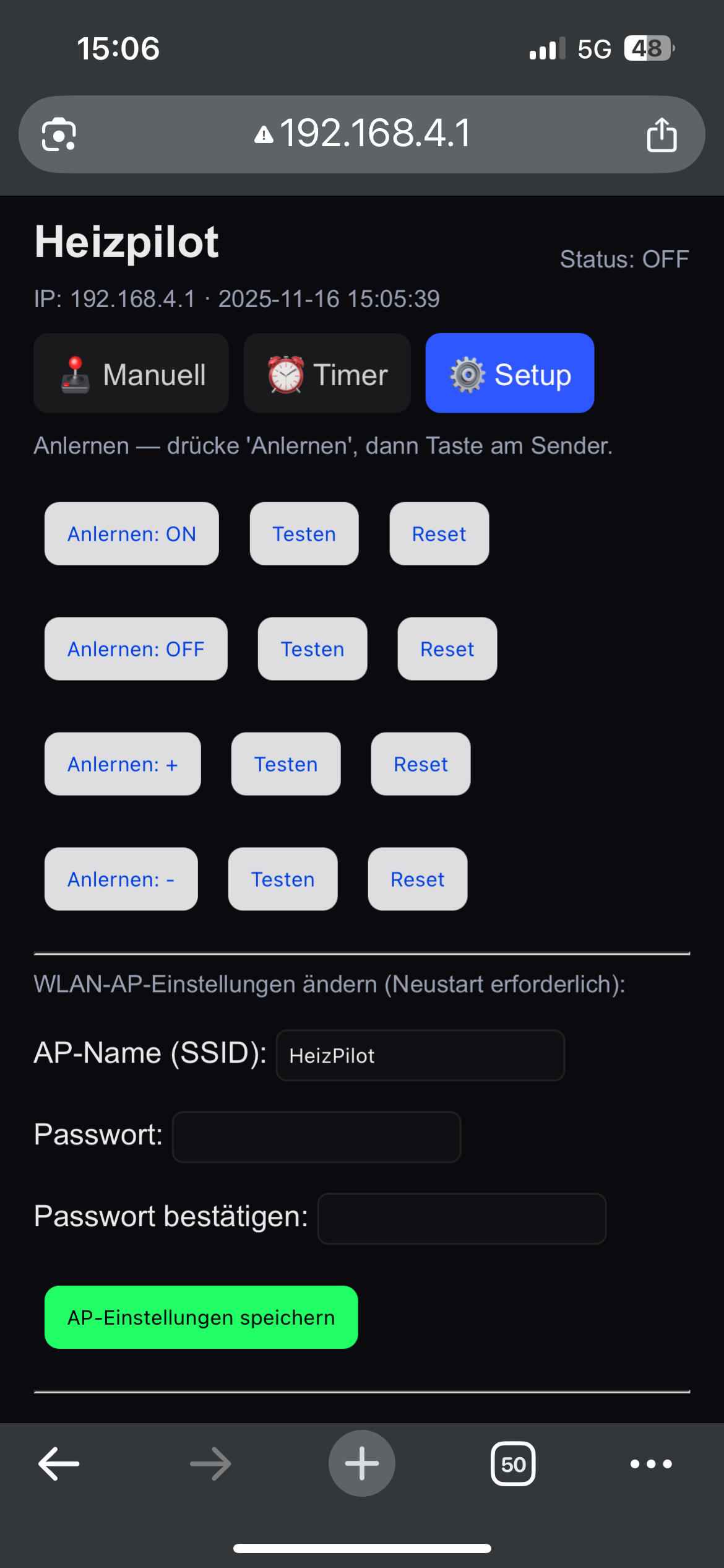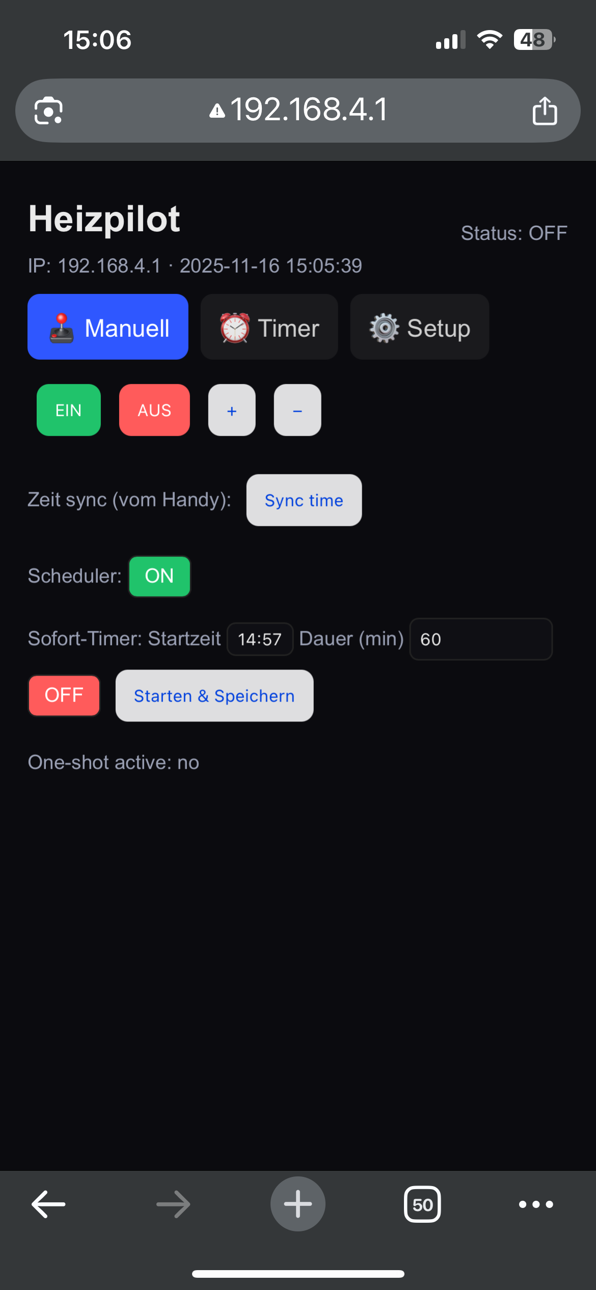 Hab mir für meine Bus eine Vevor 2Kw Heizung gekauft .Aber die Bedienung fand ich nicht so cool und bin dann auf das Steuern per 433Mhz gekommen weil es suche ein und Aus schaltet..Ich hab eine Esp32 einen 433 Sendemodul und ein empfägermodul verbaut und viel rumprobiert.Rausgekommen ist eine kleine Box die entweder an 12v dauerplus /ein usb Kabel mit Dauerplus oder Powerbank betrieben wird.Die Timer 2pro Tag Mo-Fr und ein extra sofortTimer .Gesteuert wird über Handy .Der ich nen ihn mal HeizPilot erzeugt ein kleines Netzwerk und stellt eine html Seite zu Verfügung also auf den Handy ins Netzwerk eineäen das Passwort eingeben und im Browser die 192.168.4.1 eingeben.Dan kommt die Seite auf der die Timer konfiguriert werden können .als erstes muss man die systemzeit mit dem Handy synconisieren