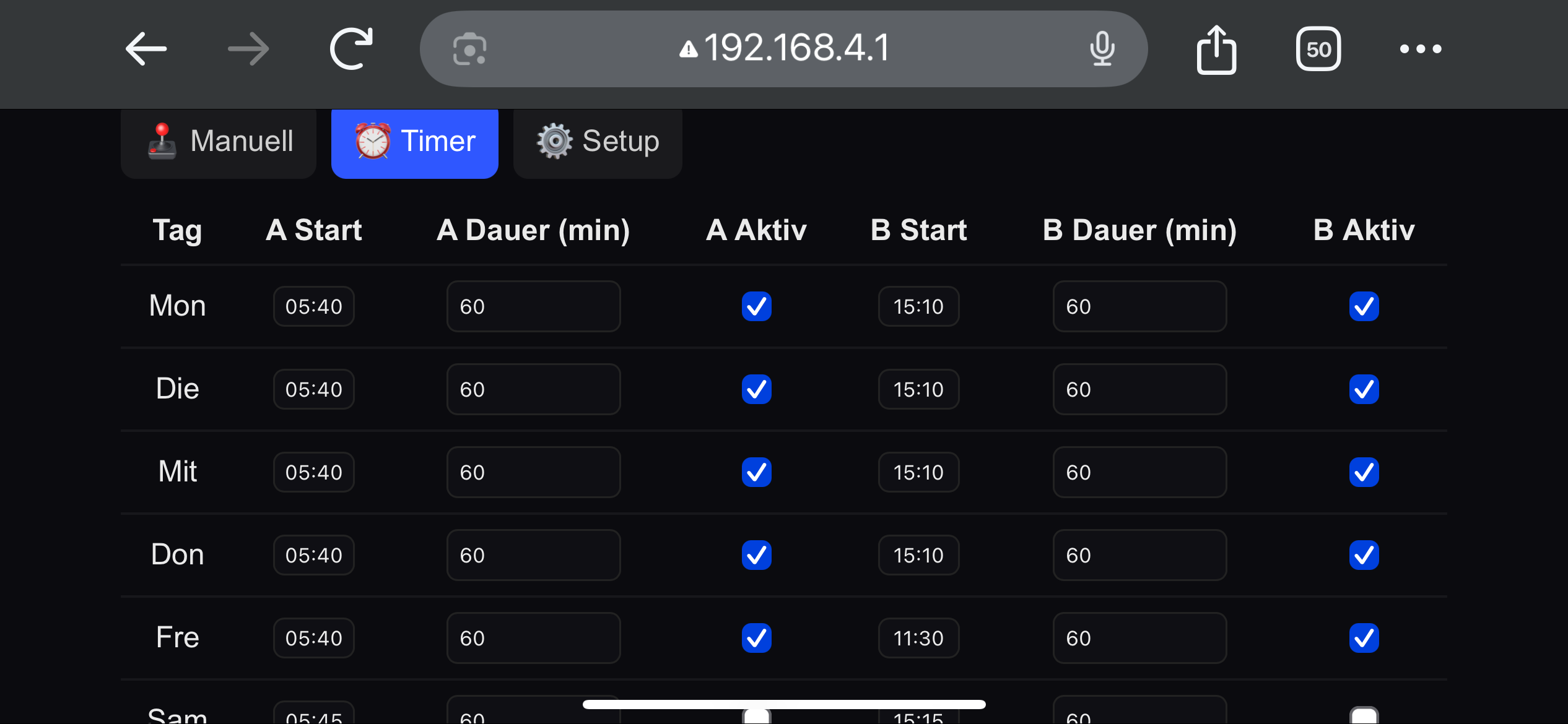 Ich habe dazu auch zwei Modi- Einmal der manuelle aufheizt mit Temp-Steuerung, der dann aber bei Überschreiten der Soll-Temp von z.B. 15 Minten lang, den Heizer abhschaltet und dann hab ich noch einen Auto-Modus der den Vevor immer unter Strom-lässt und selbstständig wieder einschaltet.Da dies kein bi-direktionales System ist und man nie weiss in welcher Heizstufe der Vevor sich selbst reguliert muss ich versuchen dessen Logik zu verstehen damit ich dies in meinem Programm berücksichtigen kann.