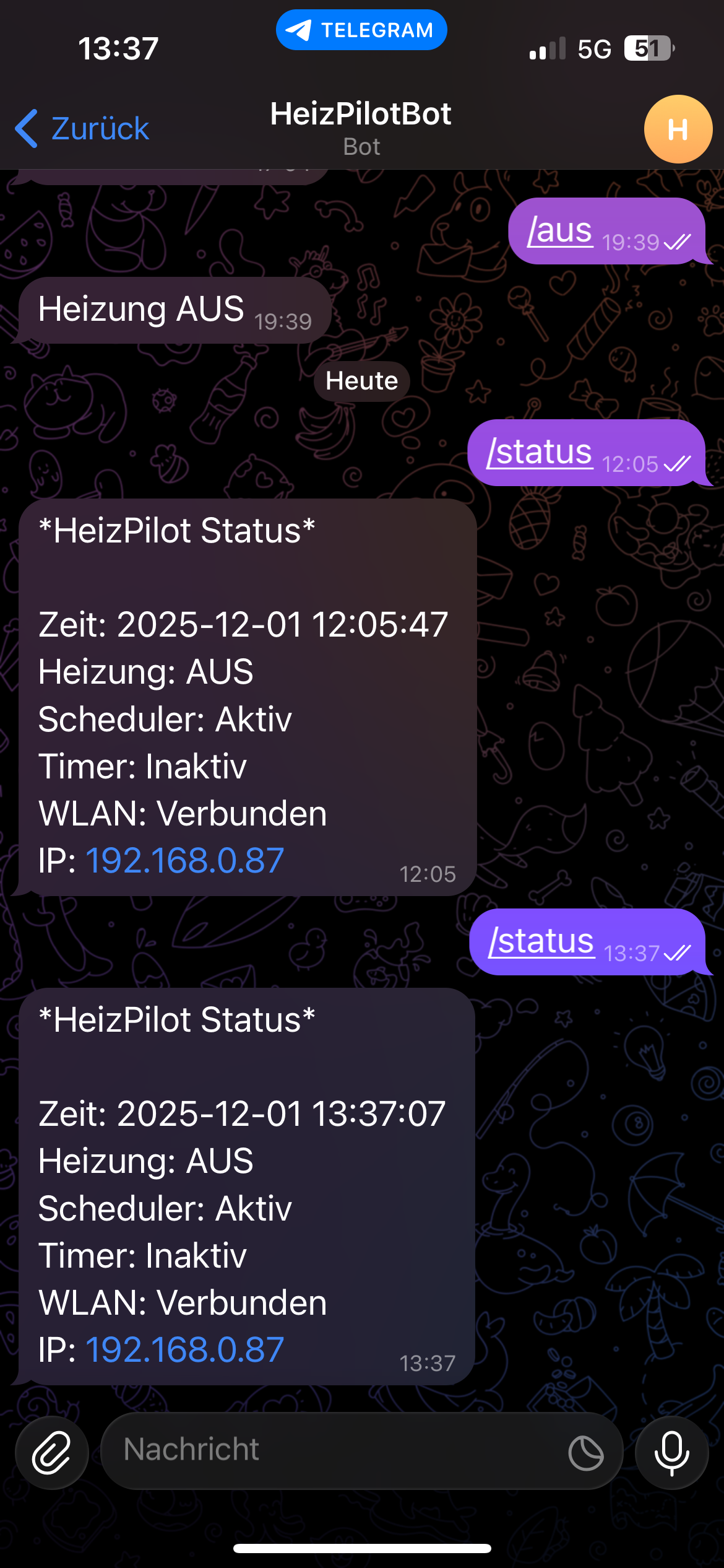 und wen du on,off,on machst auch wenn er noch am runterfahren ist geht er wieder an.also das letzte Signal ist das was am Ende in Funktion geht…ich bin momentan auch wieder weiter.und hab mir über die App Telegram und ein Chat-bot einige Befehle gebastelt um den Heizpiloten von überall her Befehle zu schicken.