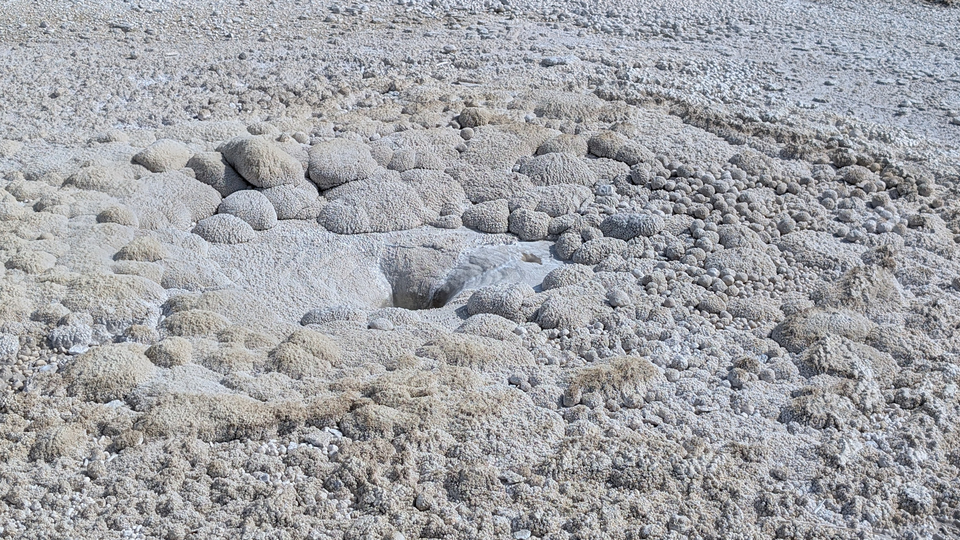 Den Parkplatz übersieht man schnell und fährt achtlos daran vorbei, was sehr schade wären. Denn der Paint Pot besteht aus einer weit gestreckten Ebene, über die heisses Wasser aus einer Quelle fliesst und Sinterterrassen erzeugt.