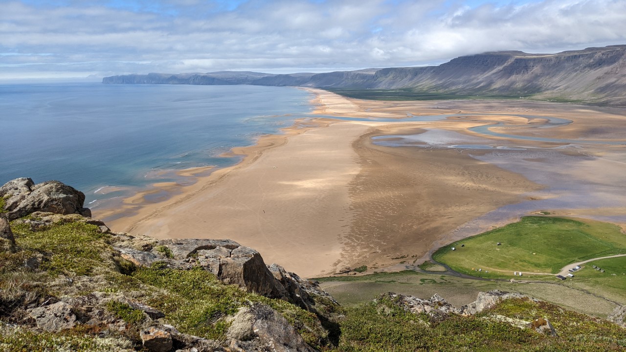 Camping Melanes. An einem gelben Sandstrand, das ist in Island die Ausnahme. Die etwas buckelige Wiese dort ist bereits der Campingplatz, es ist Platz genug um mit 50 Meter Abstand zum Nachbarn zu parken. Kein Vergleich zu der Situation z.B. auf den Horror Campingplätzen an der Nordsee, falls das einer kennt. Hier bin ich etwas den Berg hochgeklettert. Unten rechts ist der Campingplatz Melanes zu sehen. An dem lang gezogenen Sandstrand sind manchmal Seehunde. Etwas weiter links ist eine etwas versteckte Bucht, an der zwei Reisende mit einem Boot übernachtet haben. Traumhaft schön. Ich hab dort an der Küste drei Nächte gestanden. Als ich den vierten Tag bezahlen wollte meinte das Team dort: ist umsonst, lass Mal.Kaum zu glauben, dass diese Aufnahme in Island gemacht wurde. Waschtag. Dafür such ich noch eine gute Lösung. Wenn kein Baum in der Nähe ist, um eine Wäscheleine zu spannen häng ich immer alles über den Truck. Trocknet natürlich auch. Die Westfjorde haben viele heisse Quellen. Das Krosslaug Badebecken hier gibts seit etwa 1950. Es liegt direkt an der 62 und ist auch kein Geheimtip mehr. Direkt am Meer, es wird um eine Spende in eine Box gebeten. Angenehm warm, wer es noch wärmer mag: ganz rechts ist ein Hotpot, der hat dann ca 41 Grad.Es blubbert etwas, auf dem Bild sieht man, wie Blasen aufsteigen. Gelegentlich fliegt ein Vogel vorbei, es ist angenehm warm und man blickt einfach so über das Watt zum Meer und denkt an nichts besonderes. Bei Hochwasser müsste man das Gefühl haben, allein mitten im Meer zu schwimmen. Ich hab an dem Vormittag zum Glück einen Moment erwischt, wo gerade weniger los war. Abends sind sowohl das Badebecken als auch der Hotpot voll. Offiziell ist das frei stehen in Island nicht erlaubt, die Leute sollen auf die Campingplätze. Geschuldet ist das den diversen Campervans ohne Klo und rücksichtslosen Reisegruppen. Solange man sich nicht ausbreitet und die Umwelt verschmutzt, sagt meist keiner etwas. Ein weiterer Badepool, ebenfalls warm und mit Blick aufs Meer. Gespeist wird das ganze stets von unterirdischen, heissen Quellen. Offen für jeden.In der Campingküche. In den Kochecken warten oft übrig gebliebene Vorräte anderer Gäste. Dann kann man sich überlegen, wie man eine original Koreanische Suppe mit polnischen Nudeln und eigenen Vorräten aus dem Kühlschrank zu etwas leckerem verkocht. Die Geburtstagskerzen hab ich nachgezählt. Es waren exakt 24, wie auf der Verpackung vom Hersteller angegeben, 4 davon waren verwendet. Also hat hier ein kleiner Gast in den Westfjorden Islands seinen vierjährigen Geburtstag gefeiert. Wie parken die Leute eigentlich ihre Autos ? Den hier hatte ich oben von der Strasse aus entdeckt. Als LKW Fahrer sieht man manchmal mehr. Wenn mir etwas komisch (oder interessant) vorkommt halte ich an und geh der Sache auf den Grund. Das Fahrzeug hier stand aber schon länger aufgegeben am Strand. Ich hatte einen Unfall für möglich gehalten. Die Isländer: schrullige Messies vor dem Herrn. Überall rosten Fahrzeuge und antike Schätze vor sich hin, nichts wird recycelt, alles wird aufgehoben. Oder zum Museum erklärt, wie hier in Hnjotur.