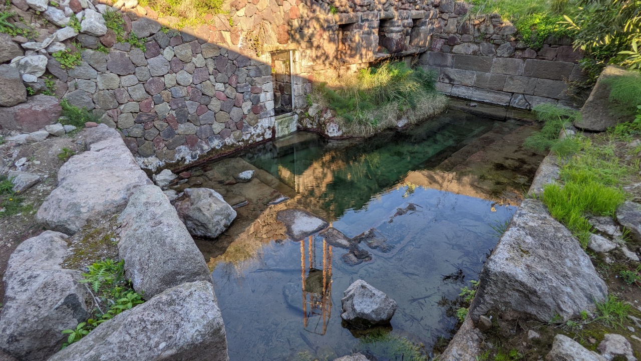 Anders als ich es erwartet hätte riecht das Wasser nicht nach Schwefel. Das 43 Grad heisse Quellwasser kühlt sofort ab, wenn es ins Becken läuft. Eine heisse Dusche gibt es, wenn man auf die Quader Stufe direkt vor der Quellöffnung klettert und eine Akku Brause in das kleine Becken hängt. Das grosse Becken eignet sich eher zur Abkühlung.