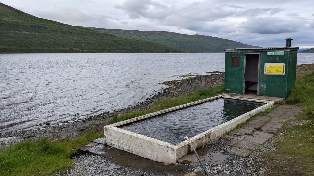 Ganz am Anfang der 643 lockt in Laugarholl zunächst eine prima Badestelle. Die meisten Badestellen bestehen aus einer Wanne + einer Spendenbox für den Unterhalt. Manchmal sind die Anlagen grösser, so wie hier und professionell von einem Hotel betrieben. Da oben hab ich für 600 ISK gebadet, das sind 4 Euro. Bezahlbar ! Wenn dort gerade Familiengeburtstag ist, wartet man am besten etwas. Vormittags ist die ideale Zeit zum baden, kaum was los. Abends wird das Bad oft zum Treffpunkt der Touristen, die sich stundenlang von den erlittenen Strapazen (?) in einem heissen Bad erholen wollen.