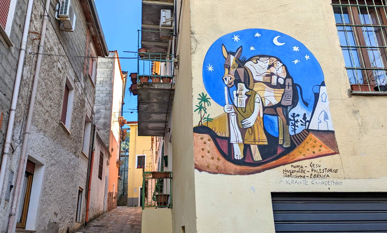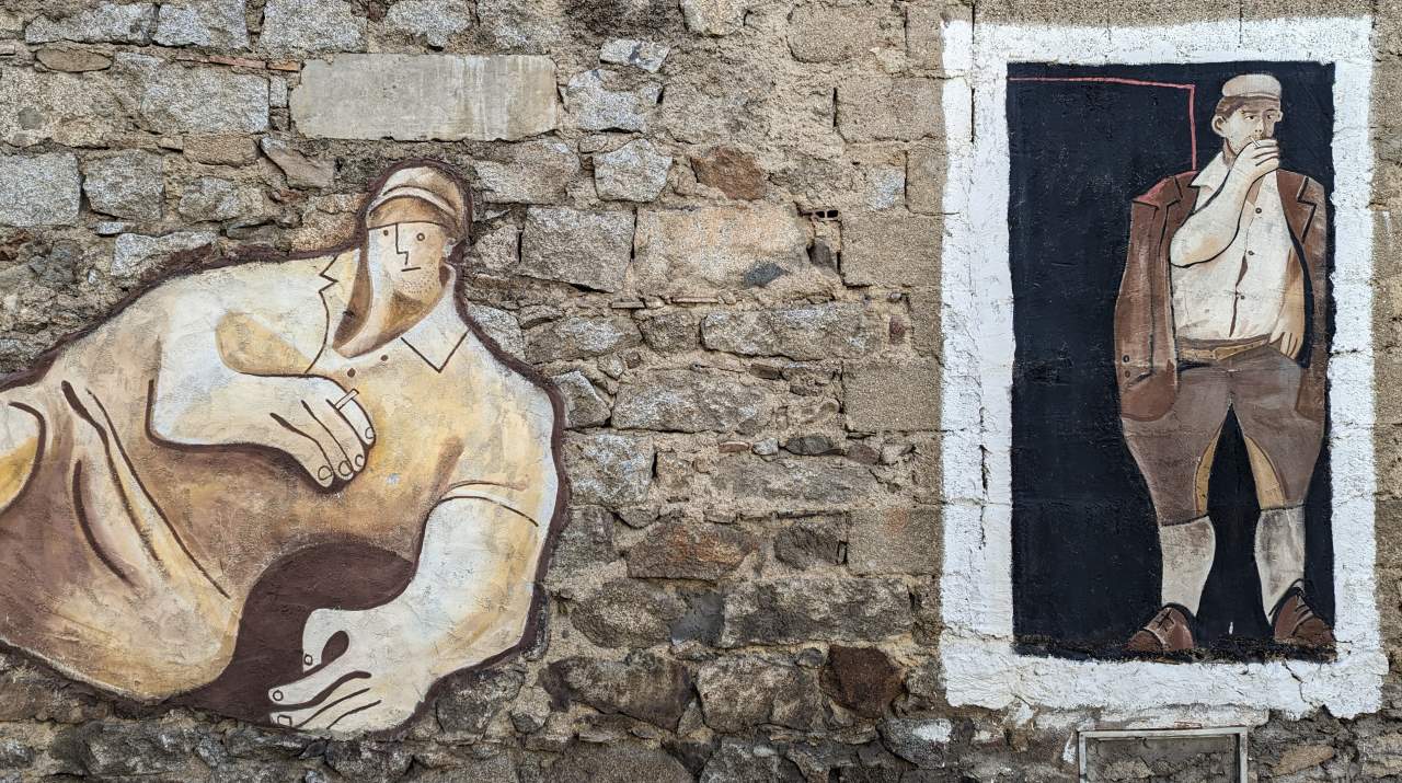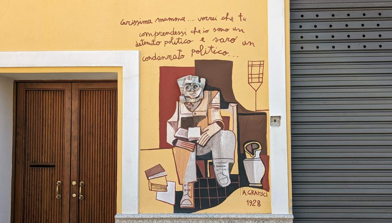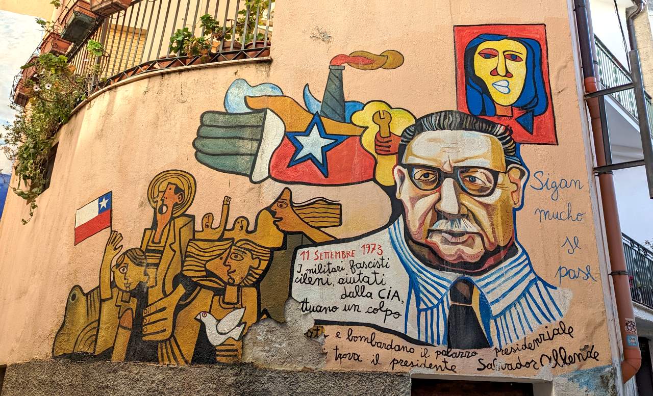 Einfach nur schräg ! In der Corso Republica, in der Nähe der Banco de SardegnaEin weiteres Beispiel für die Stilrichtung des Kubismus aus der Freiluftgalerie Orgosolo. An der Corso Repubblica.Diese Bilder sind damals um die Welt gegangen: der 30.September 2000 im israelisch besetzten Gaza Streifen. Ein Vater gerät mit seinem 12 jährigen Sohn ins Schussfeld israelischer Soldaten und versucht verzweifelt, hinter einer Beton Säule Deckung zu finden. Sein Sohn stirbt im Kugelhagel. Der Schütze wird nie ermittelt. Ebenfalls an der An der Corso Repubblica zu finden. Der industriell geprägte Norden Italiens – und das ländliche Sardinien ? Viele Bauern mussten dem Militär weichen, um Platz für Übungsplätze zu machen. Bis heute sind grosse Teile der Insel militärisches Sperrgebiet. Schönes Detail einer Wandmalerei, an der Corso RepubblicaInteressanterweise beziehen die Malereien selten den Untergrund mit ein. Im Gegensatz zu Graffities von Banksy spielen die Bilder nie mit dem Untergrund. Oder beziehen Gitterfenster, Löcher, Fensterbänke oder herausragende Strukturen in die Bilder ein. Alle Malereien sind immer auf einer Fläche wie einer Leinwand. „Wollen sie die vier Mohren kaufen ?“ Eine Anspielung auf die Flagge Sardiniens, die vier schwarzafrikanische Köpfe zeigt. Afrikanische Einwanderer haben in Sardinien keinen guten Stand. Oft finden sie nur im Sommer als Souvenir Verkäufer Arbeit. Mohr ist eine veraltete Bezeichnung für einen Äquatorianer. An der Corso Repubblica Richtung Via Docana. Okay sorry, da ist jetzt leider keine Wandmalerei zu sehen. Aber ich fand den Kontrast aus Blau, Orange und Weiss einfach cool und teile es daher Mal. Jose „Pepe“ Mujica, von 2010 bis 2015 pragmatischer Präsident Uruguays. Platz in der Via Antonio Gramsci Übersetzung etwa so: „Wir haben Geld, um Wasser auf anderen Planeten zu suchen. Gibt es nicht bereits Formen von intelligentem Leben auf der Erde ?“ Gesehen in der Via Leguria. Ein Portrait von Antonio Gramsci, einem marxistischen Philosophen und Gründungsmitglied der kommunistischen Partei Italiens. Aus einem Brief an seine Mutter: ich bin ein politischer Gefangener und werde ein politisch Verurteilter sein. In der Via Antonio Gramsci fotografiert. Eines der letzten Wandbilder aus dem Jahr 2020. Bilder, die aktuelle Themen wie Corona oder die Ukraine thematisieren gibt es noch nicht. Eine sinnvolle Übersetzung ist mir leider nicht gelungen und Google Lens hat sich ebenfalls die Zähne ausgebissen. Trotzdem schön anzusehen … Jesus, als Flüchtling. Ecke Via Cavour / Via MazziniOft wird das Dorfleben der Arbeiter und Bauern auf den Bildern thematisiert. Der 11 September (9-11) 1973. Der demokratisch gewählte Präsident Chiles Salvador Allende wird durch einen Putsch gestürzt und begeht Suizid. Für die Planung und die Finanzierung sind die USA / CIA zuständig. Es folgt eine bis 1990 andauernde Militär Diktatur unter Augusto Pinochet. Die Morde gehen in die Tausende, ebenso die der aus dem Land geflohenen Menschen. Murales in der Via Locoe, oberhalb der Poste Italiane.