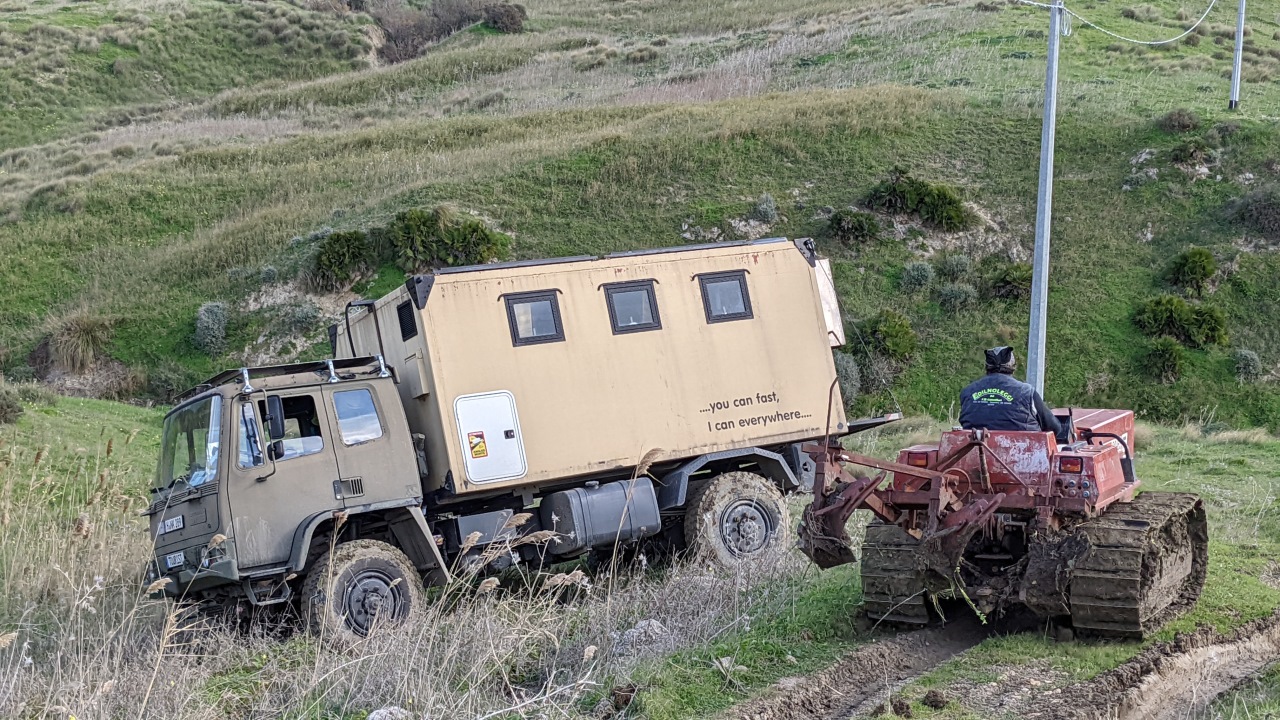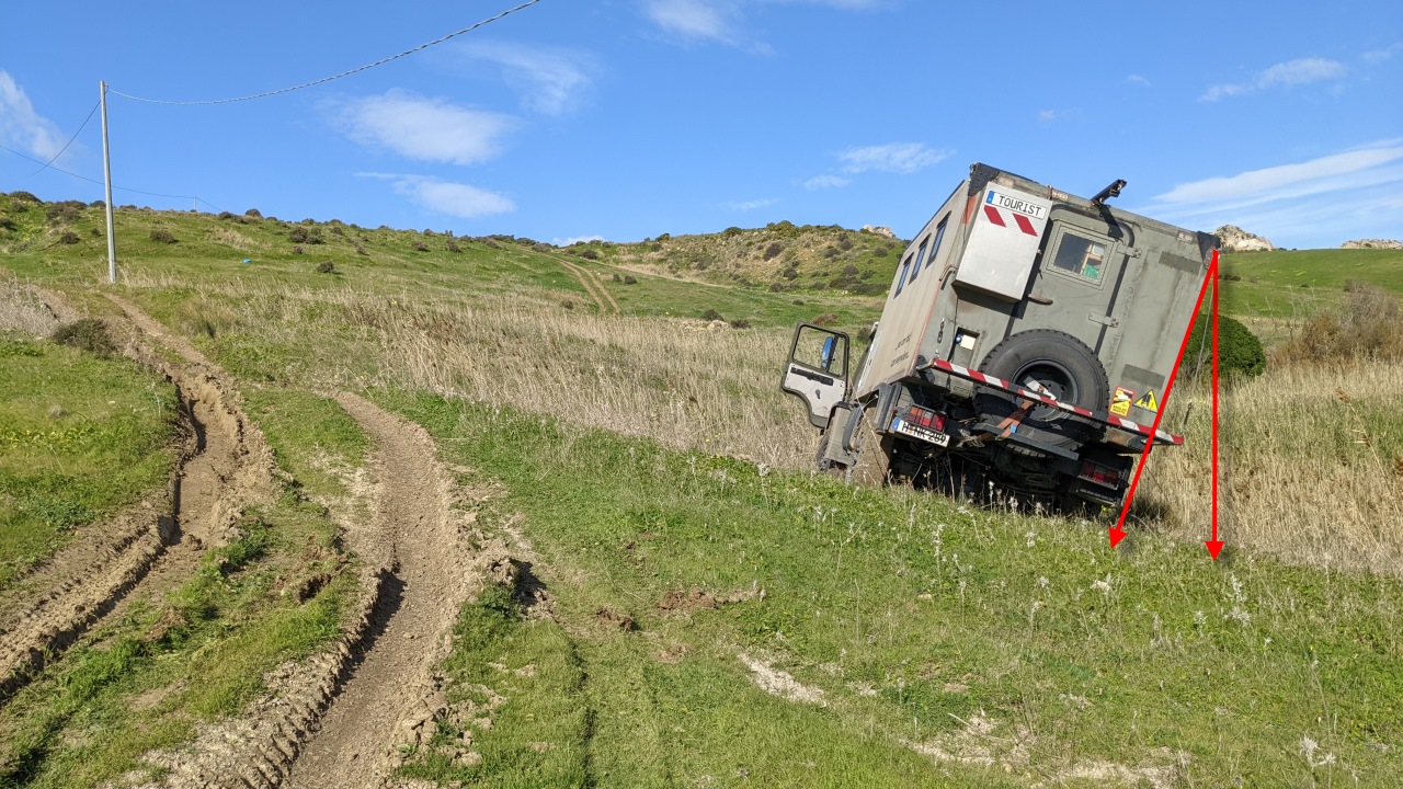 Zum Glück war ein Bauer mit einem Raupenschlepper in der Nähe. Bei der Bergung war es wichtig, mich trotz bedenklicher Schräglage zunächst gerade nach hinten zu ziehen. Der Bauer wollte mich eigentlich schräg auf den Weg ziehen, entgegen der Neigung. Gefühlt richtig, aber das hätte für ein Kippmoment gesorgt und den Truck endgültig auf die Seite gelegt. Nach 3 Metern Rückwärts stand der Truck sofort wieder gerade. Ich hab dann noch vereinbart, dass er mich durch die matschige Stelle komplett den ganzen Berg rauf zieht, was auch problemlos funktioniert hat. Für ihn und seinen Freund, die alles liegen gelassen haben und sofort gekommen sind gabs daraufhin ein sehr ordentliches Taschengeld. Erst wollten die beiden das nicht annehmen. Ich hab jedoch gesagt: ich zahl hier weder ein Hotel, noch ein Restaurant und der Diesel ist aus Deutschland. Das gesparte Geld ist dann für solche Notfälle und für die Arbeiter auf dem Land. Das war dann okay für die beiden. Den Spruch an der Seite müsste ich vermutlich Mal um *almost ergänzen …
