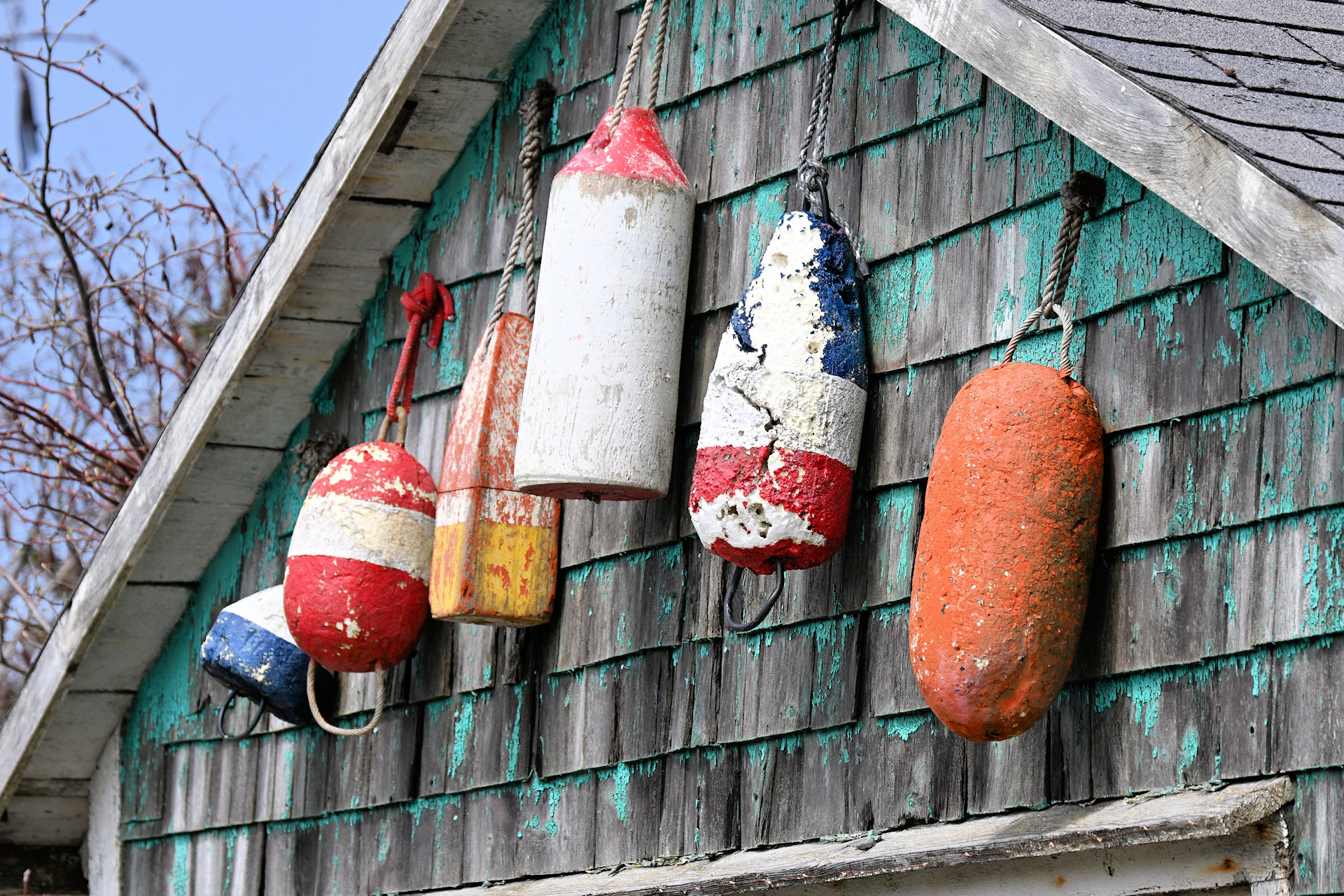 Eine Fischerhütte am Meer, mit farbenfrohen, ausgedienten Pollern. Kanada hat schöne Banknoten, wie ich finde. Wenn man Glück hat, bekommt man farbige Münzen als Wechselgeld.