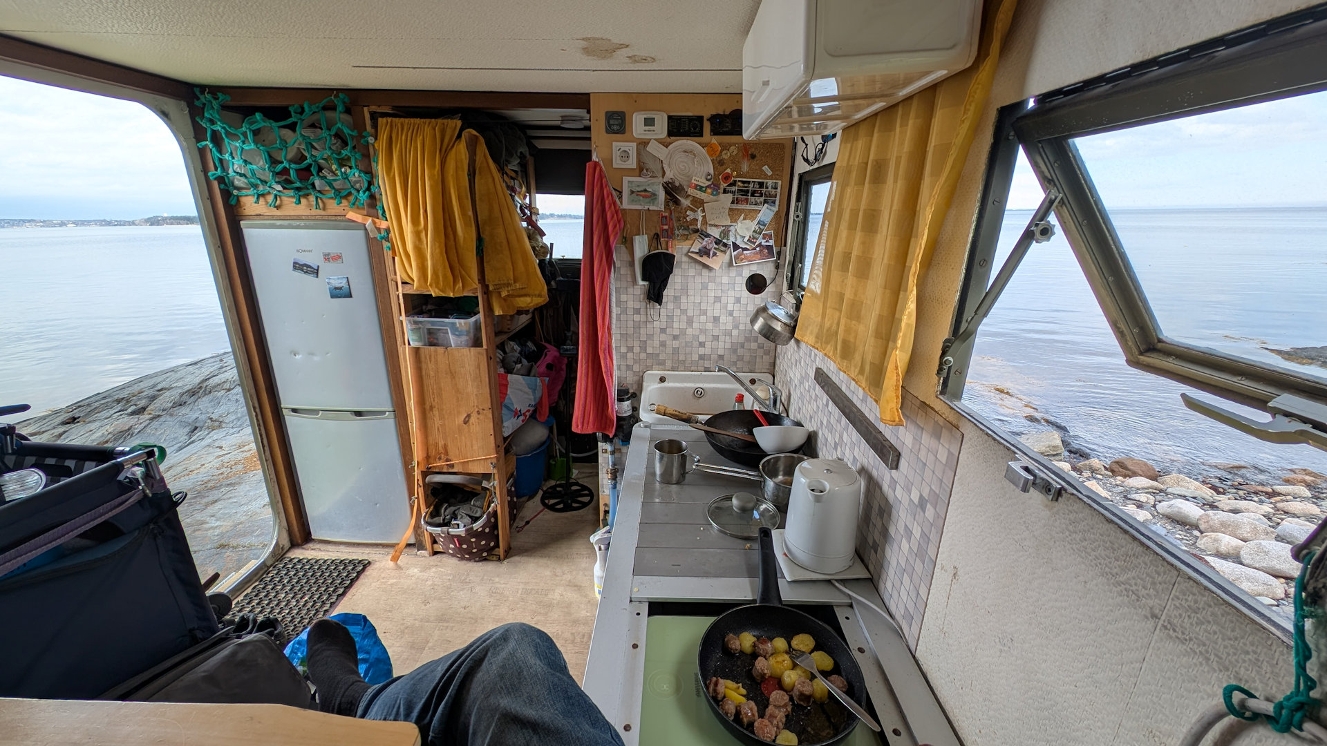 Camping bei Katie, am Meer. Innenansicht meiner Kabine, Panoramabild. Mit Blick aufs Meer, egal wo hin man schaut ! Ich hab dort bei Ebbe im Seegras herumgesucht – und tatsächlich eine 10 cent Silbermünze von 1949 gefunden. Später noch einen Kupfer Cent, der dort hinuntergerollt sein muss.