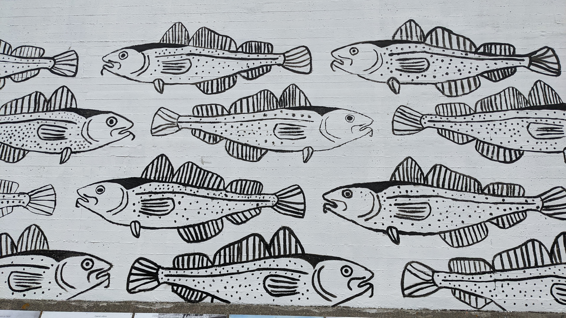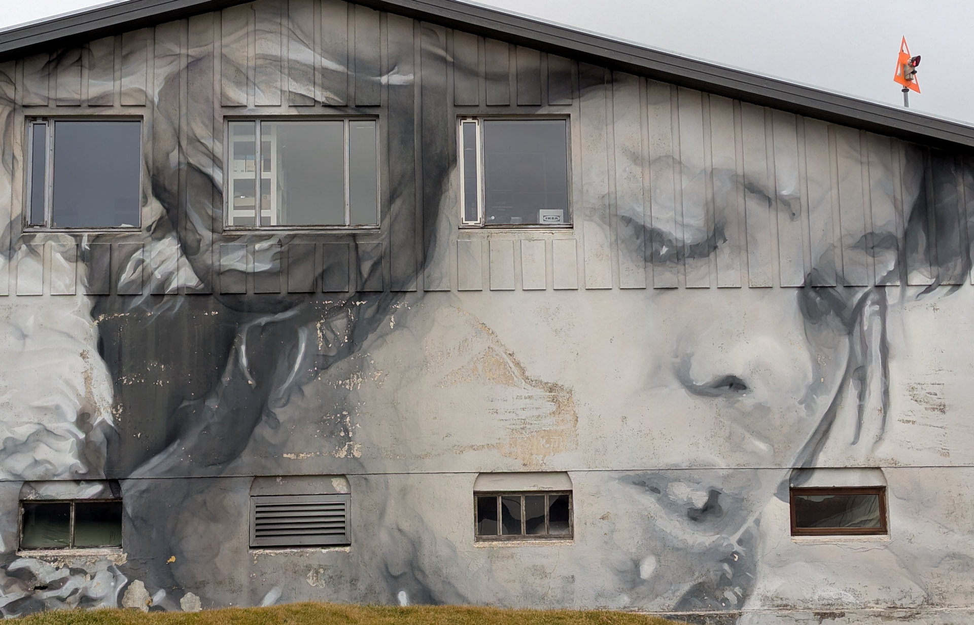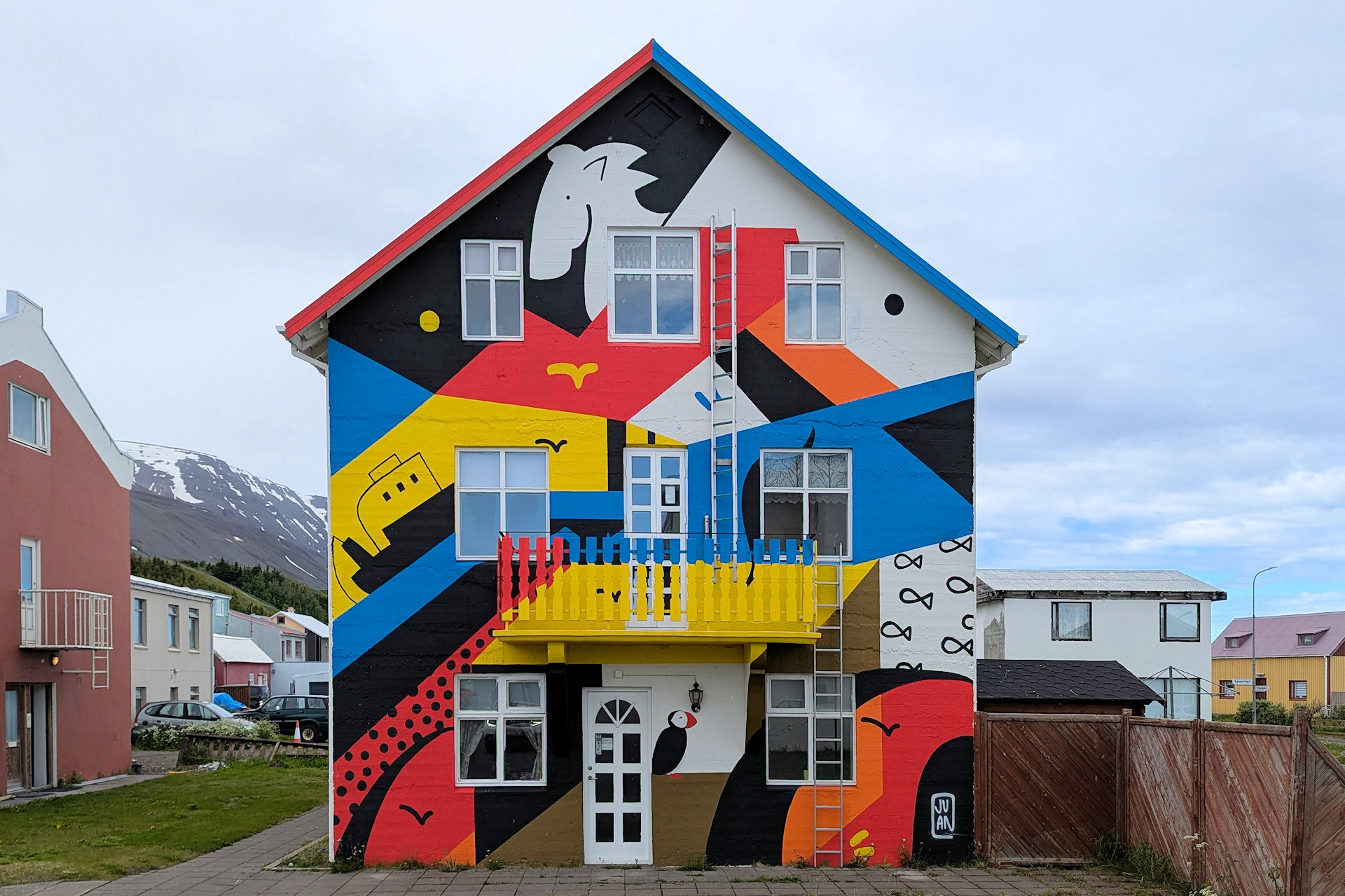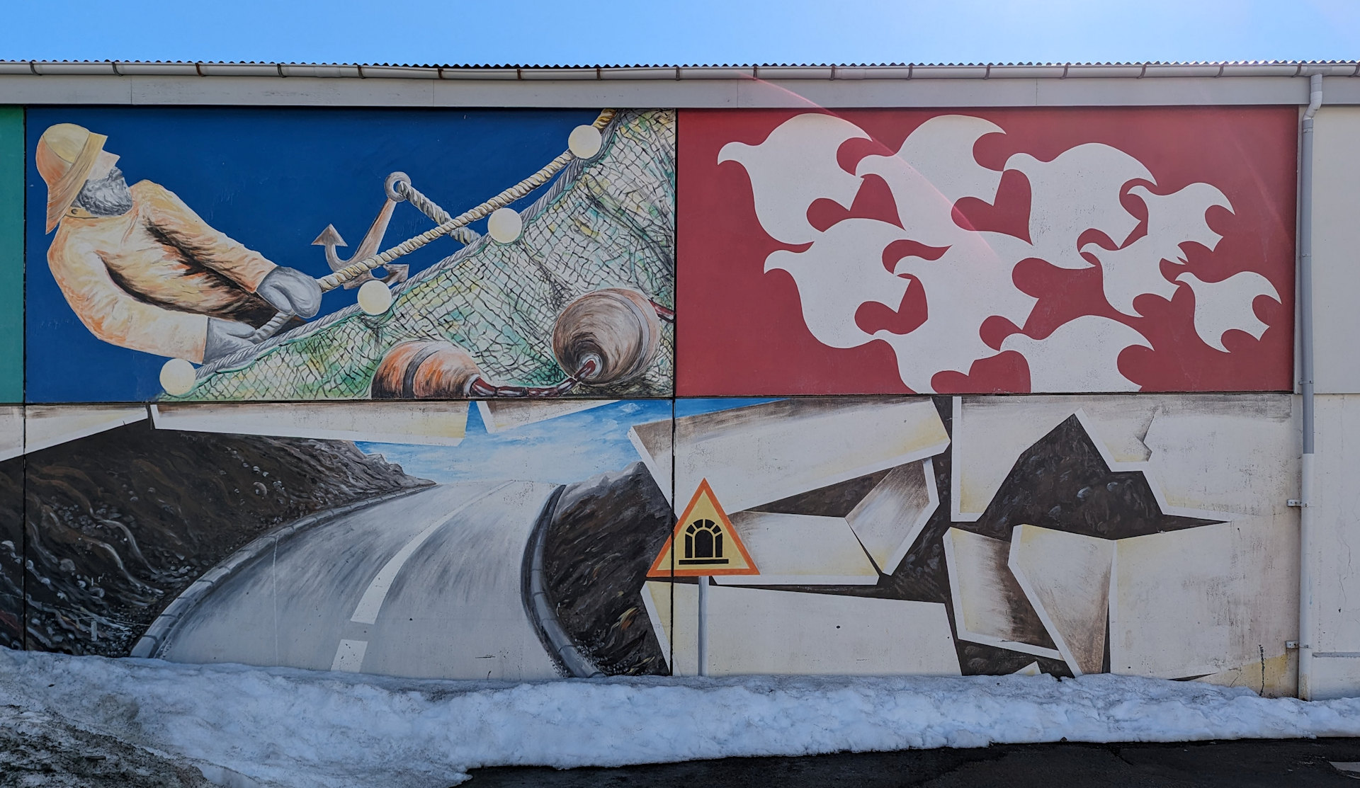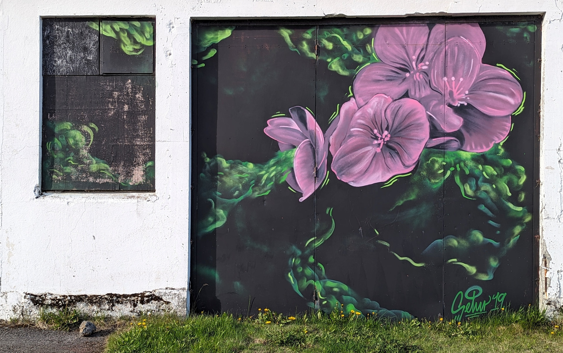 Viele meiner fotografierten Wandbilder aus Island haben die Gemeinsamkeit, dass Türen oder Fenster die Wandbilder oft etwas kaputt schneiden. So auch hier. Das bricht die Illusion eines Bildes immer etwas. Der Künstler Banksy spielt dagegen mit den lokal vorhandenen Objekten und baut sie gekonnt in seine Kunstwerke ein. Nicht jedoch bei den Künstlern in Island, ich habe dafür kein einziges Beispiel gefunden. Oft werden Schilder oder Elektroinstallationen einfach übermalt.