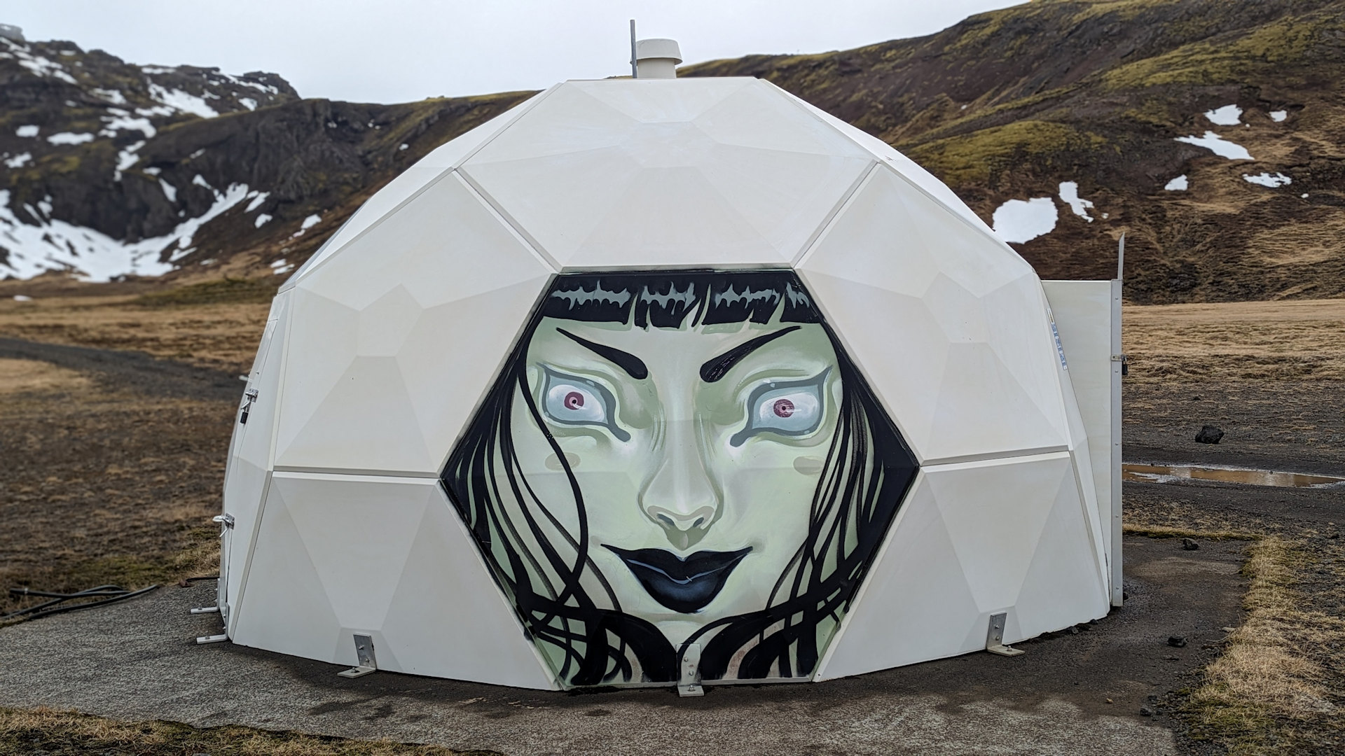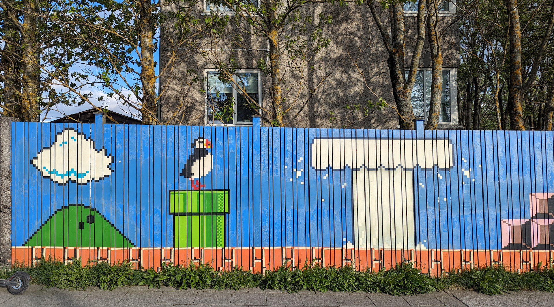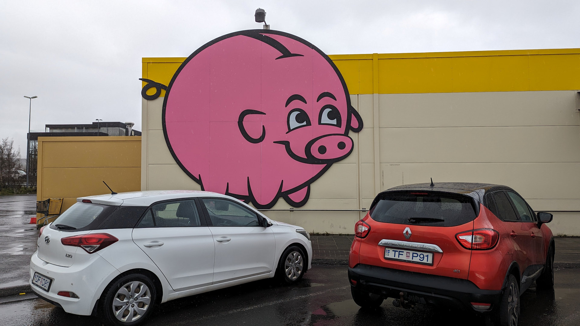 Das geodätische Haus einer Thermalquelle. Ich bin nicht ganz sicher, ob es sich hierbei um Kunst oder Graffiti handelt. Eine Signatur fehlt. Falls illegal: trotzdem schön.Bei meinem Besuch der Westmänner Inseln entdeckt. Ebenfalls die Westmänner, in der Nähe vom zentral gelegenen Spielplatz unten beim Hafen. Ein farbenfroh bemaltes Lagerhaus, Akranes.Ein ganz ähnlicher Stil bei diesem Lagerhaus in Vik, ganz im Süden von Island. Die erhöht stehende Kirche und die markanten Felsen vom schwarzen Strand finden sich hier wieder. Okay, Firmenlogo anstatt Kunstwerk. Aber das bekannte Maskottchen von Islands billigster Supermarktkette war für mich in dieser Aufnahme: Kunst. Der Comic Stil passt sowieso prima zu den anderen Aufnahmen. In Reykjavik fotografiert. Eine gelungene Anspielung auf Nintendos Super Mario Klassiker, mit einem pixeligen Puffin. Monochromes dagegen erneut aus Akranes. Eine besonders farbenfrohe Fassade in Hveragerdi, Werbung für ein Cafe. Übersetzung: das ist keine Garnele. Entweder Kunst oder eine Anspielung darauf, dass in Island eher grosse Hummer gefangen werden, kein Granat. Vermute ich, nur geraten.