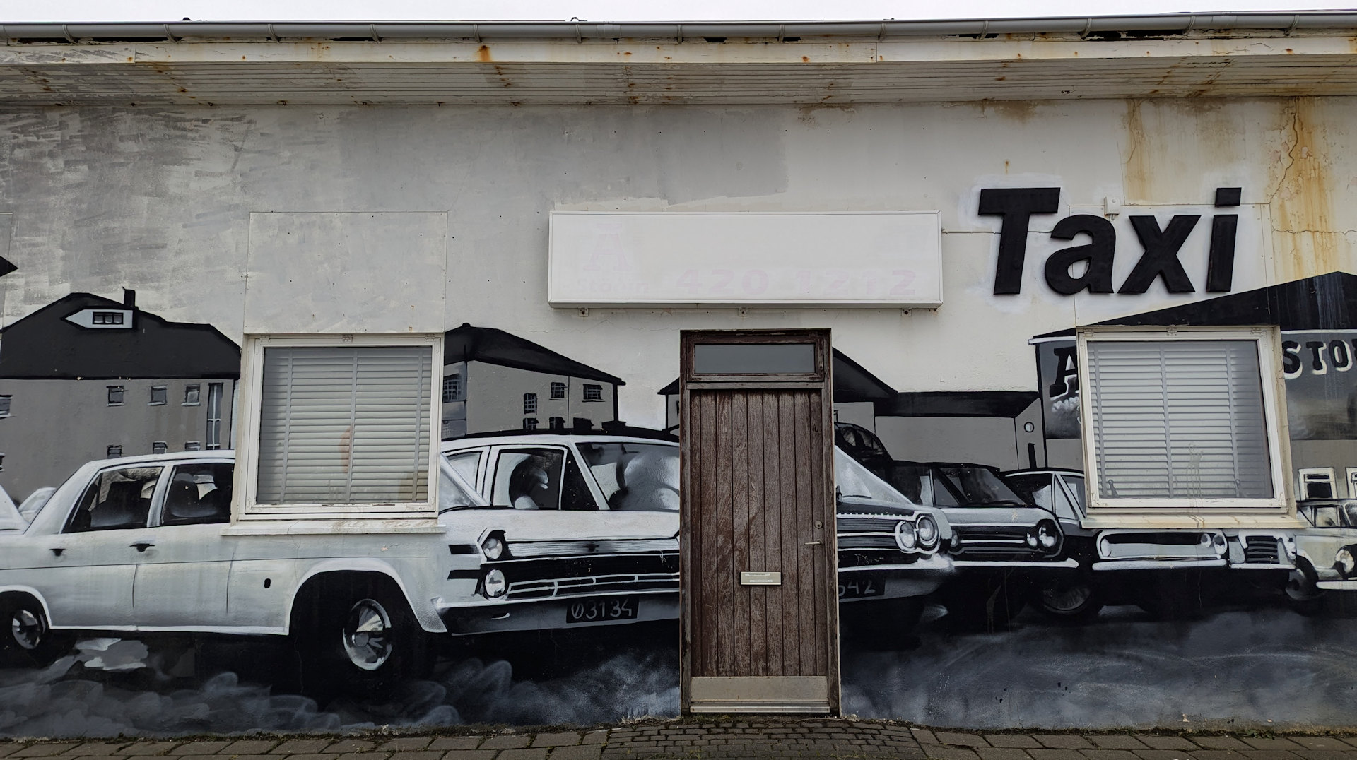 Ein buntes, von den Bewohner selbst bemaltes Haus in Saudarkrokur. Wandbild einer Taxizentrale, Reykanjes Halbinsel.