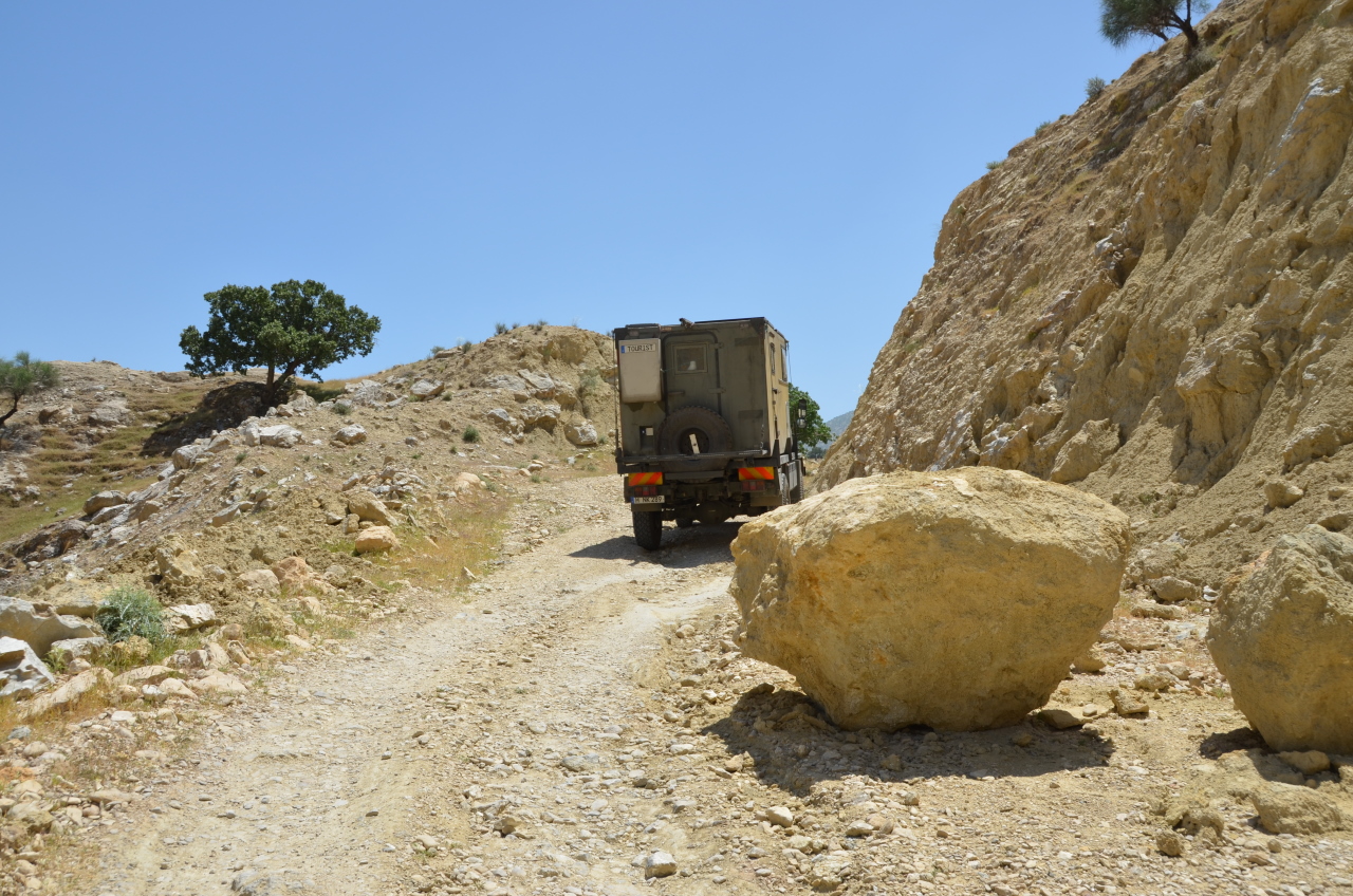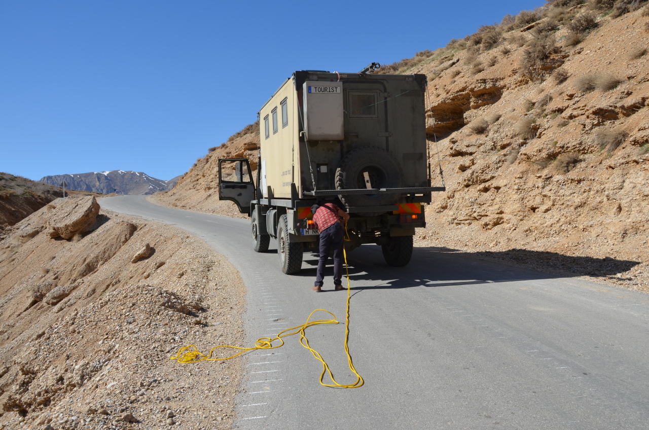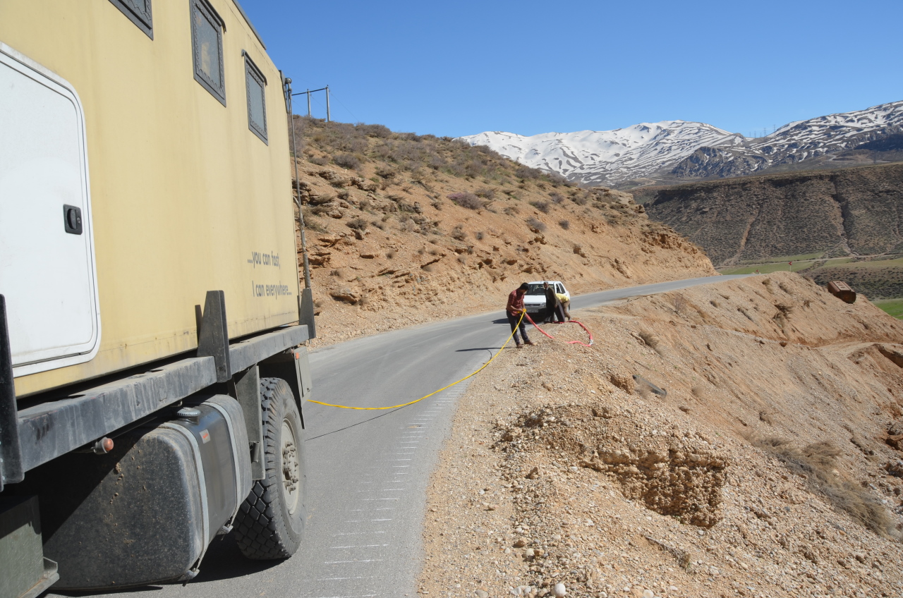 Abschleppaktion in den Bergen. Ich hab den kleinen Saipa den steilen Hang rechts hochgezogen. 25% Steigung waren dann doch etwas zuviel für dieses Fahrzeug. Für den DAF kein Problem, vorsichtshalber hatte ich noch die Geländeuntersetzung drin, damit hat er richtig Kraft.Rot: meine LKW Abschlepp Seile . Die beiden Iraner waren heil froh, aus dieser Falle raus zu sein.Gelb: das Abschleppseil der Iraner, mit dem hatten wir meine roten Abschleppseile noch etwas verlängert, so dass der DAF nicht von der Strasse runter mußte. Das war nur eine bessere Wäscheleine, hat für den Kleinwagen aber gereicht.Schäfer Idyll in den BergenNachtparkplatz in den Bergen, beim Frühstück war der DAF plötzlich von Ziegen eingeschlossen.Izeh, in Stein gehauene Huldigung für einen längst vergessenen KönigDie berühmte Berghöhe mit Relief, ebenfalls IzehIn den BergenIm Iran selbstverständlich: Freilufthaltung der TiereLandschaftlich einmalig Diese Muster werden von weidenden Ziegen angelegtUnterwegs in KhuzestanOK ich muss gestehen, dass ich wirklich sehr viele Schafe und Ziegen fotografiert habe. Mich hat das Bild der friedlich weidenden Tiere immer sehr berührt, um das einzufangen habe ich unzählige Male angehalten und fotografiert.Ich hab im Iran abseits der Strassen oft Getreidefelder entdeckt, auf kleinen Plateaus mitten in den Bergen. Dabei habe ich mich immer gefragt: wie bekommen die eigentlich eine Erntemaschine hier rauf ? Nun, die Antwort ist ganz einfach: es wird per Hand geerntet, wie bei uns vor 200 Jahren.Ich war sehr froh, die Arbeiter fotografieren zu dürfen und hab mich dann mit kalten Getränken aus dem Truck revanchiert. Hier sieht man das Getreide bereit zum Abtransport.Kleine Bergeaktion, dieser Fels lag im Weg. Wenden ging nicht, dran vorbei fahren auch nicht. Geholfen haben die Abschleppseile, von denen kann man nicht genug dabei haben.An dem Stein hier bin ich zum Glück auch so vorbei gekommen. Berge rund um Shiraz. Das Camping dort in der Natur war wunderschön. Koordinaten: 29.977167 / 51.701604